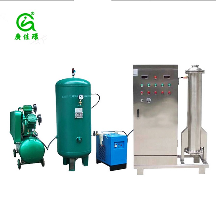 本系统配套产量500g/h的臭氧发生器1套,采用空气源,外置无油空压机、冷干机、精密过滤器、储气罐、蜂窝式臭氧发生器等组成。